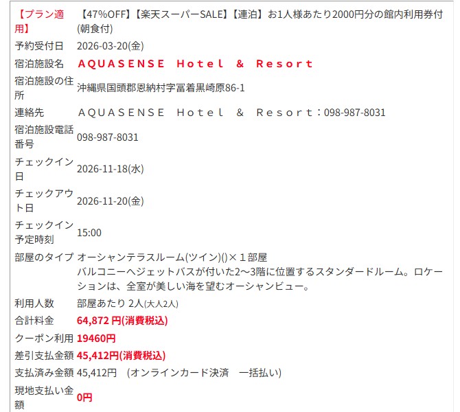 (楽天トラベル/2名2泊合計)